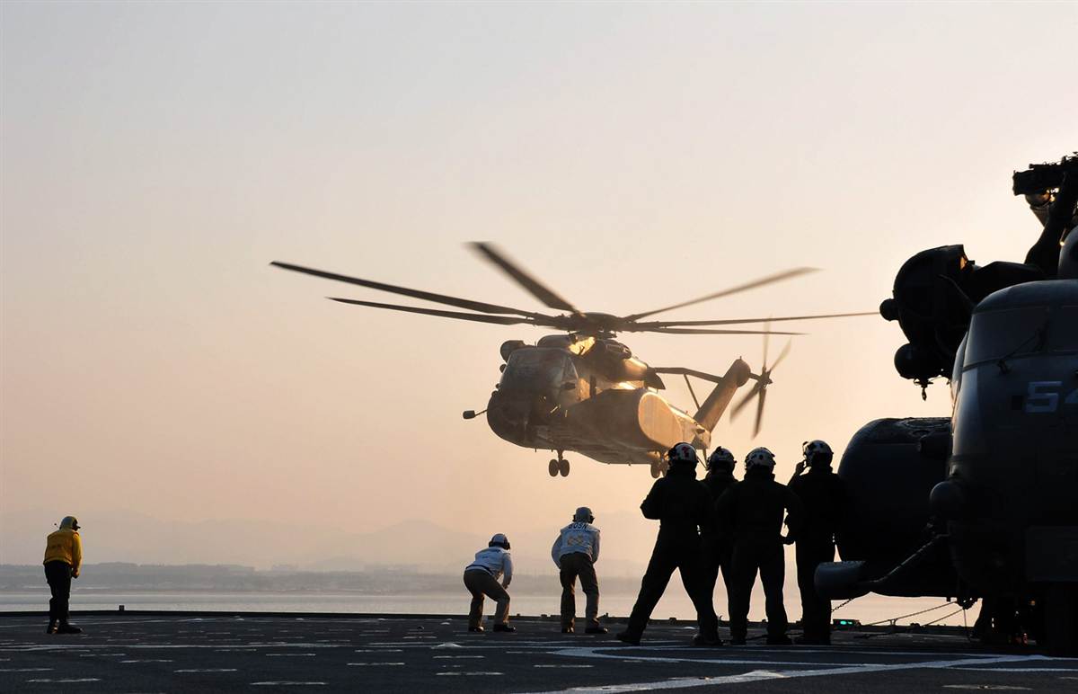 En esta imagen cedida por la Armada de los Estados Unidos, helicópteros MH-53 se posan en la pista de aterrizaje del buque de desembarco anfibio USS Tortuga (LSD 46) el 12 de marzo, en el Mar del Japón, durante las maniobras de ayuda frente al terremoto.