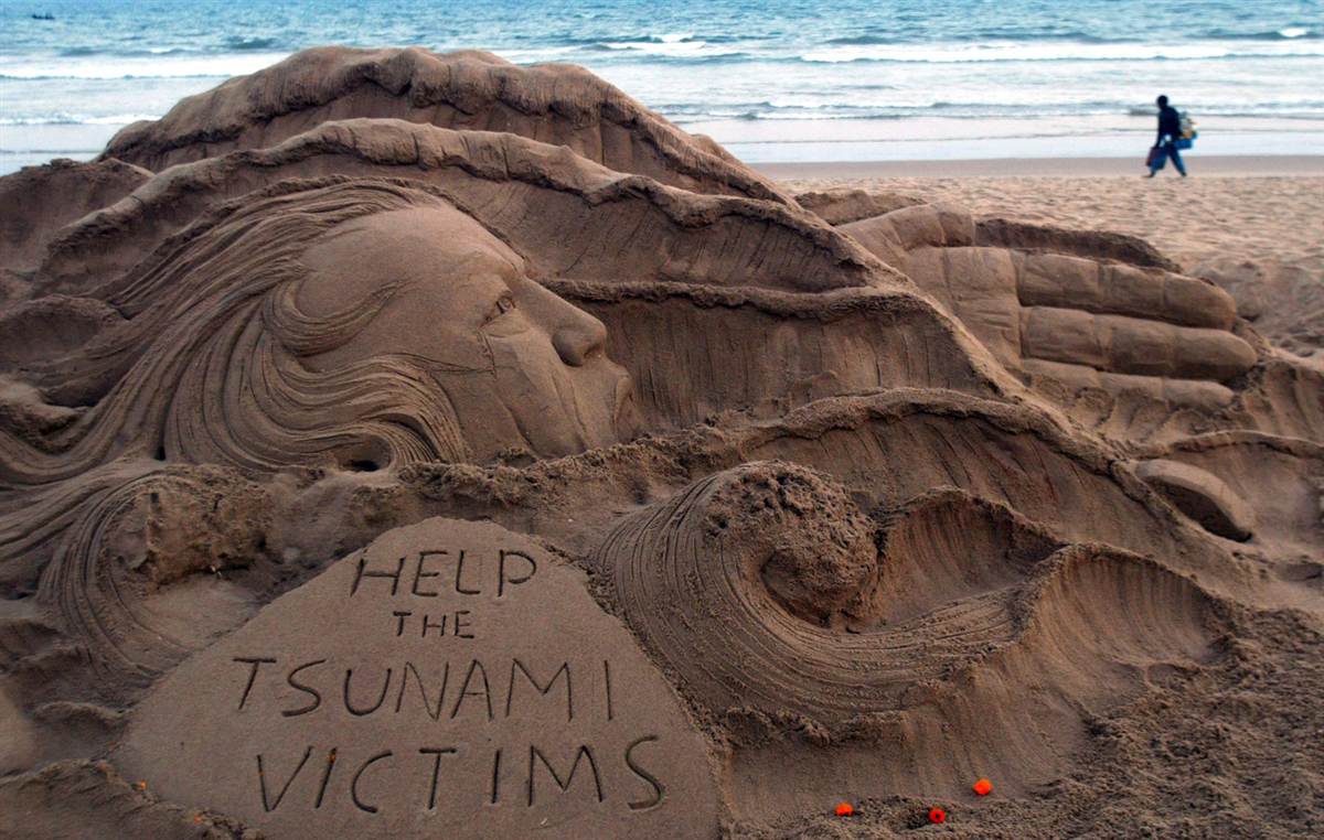Esta escultura de arena creada por el artista especialista en arena Sudarshan Pattnaik, fue creada con motivo de concienciar sobre el tsunami que azotó Japón. Se realizó en el centro turístico Golden Sea Beach de Bhubaneswar, India, el pasado 12 de marzo.