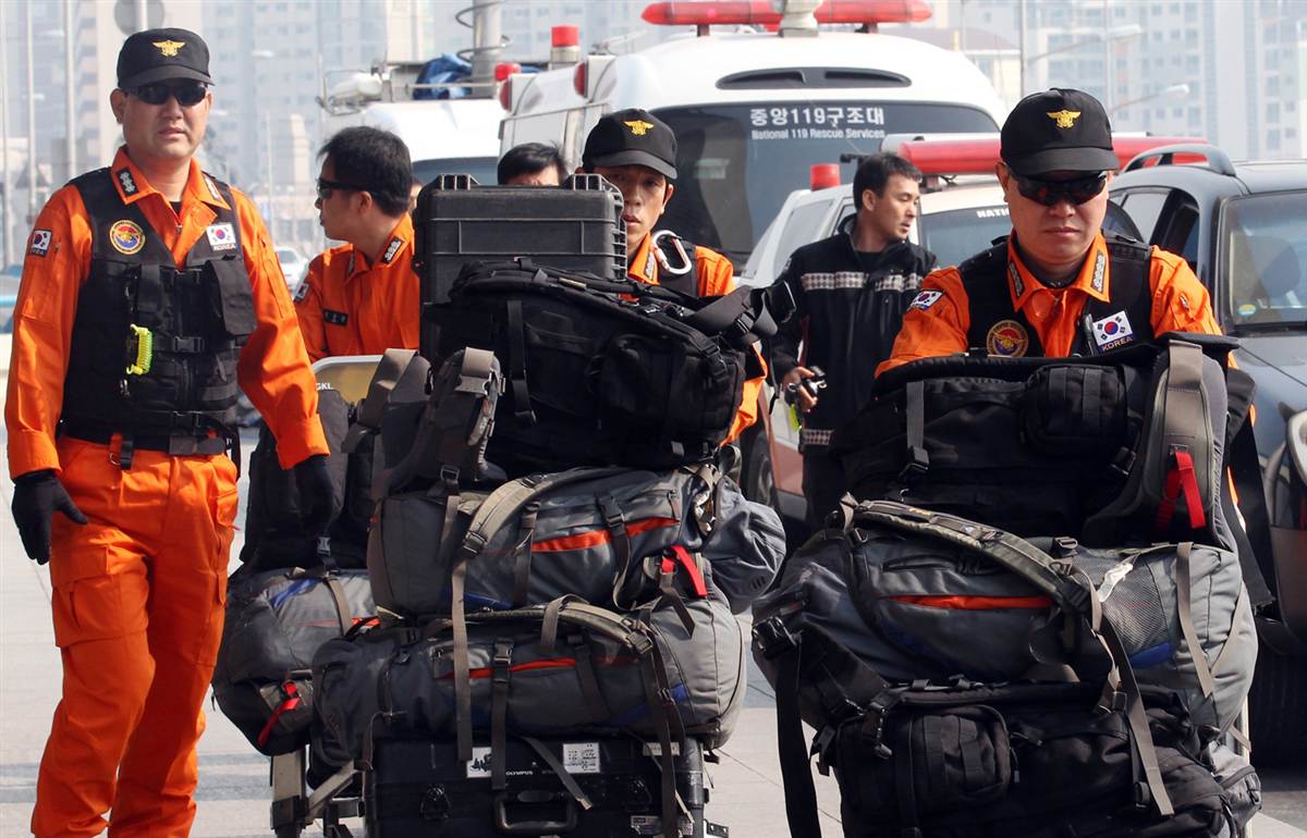 Equipos de rescate surcoreanos se preparan para partir hacia Japón desde el aeropuerto Gimpo en Seúl, el 12 de marzo. Corea del Sur envió un equipo de cinco rescatadores y dos perros rastreadores tras recibir la llamada de auxilio de Tokio tras el terremoto de magnitud 9,0 que asoló Japón.
