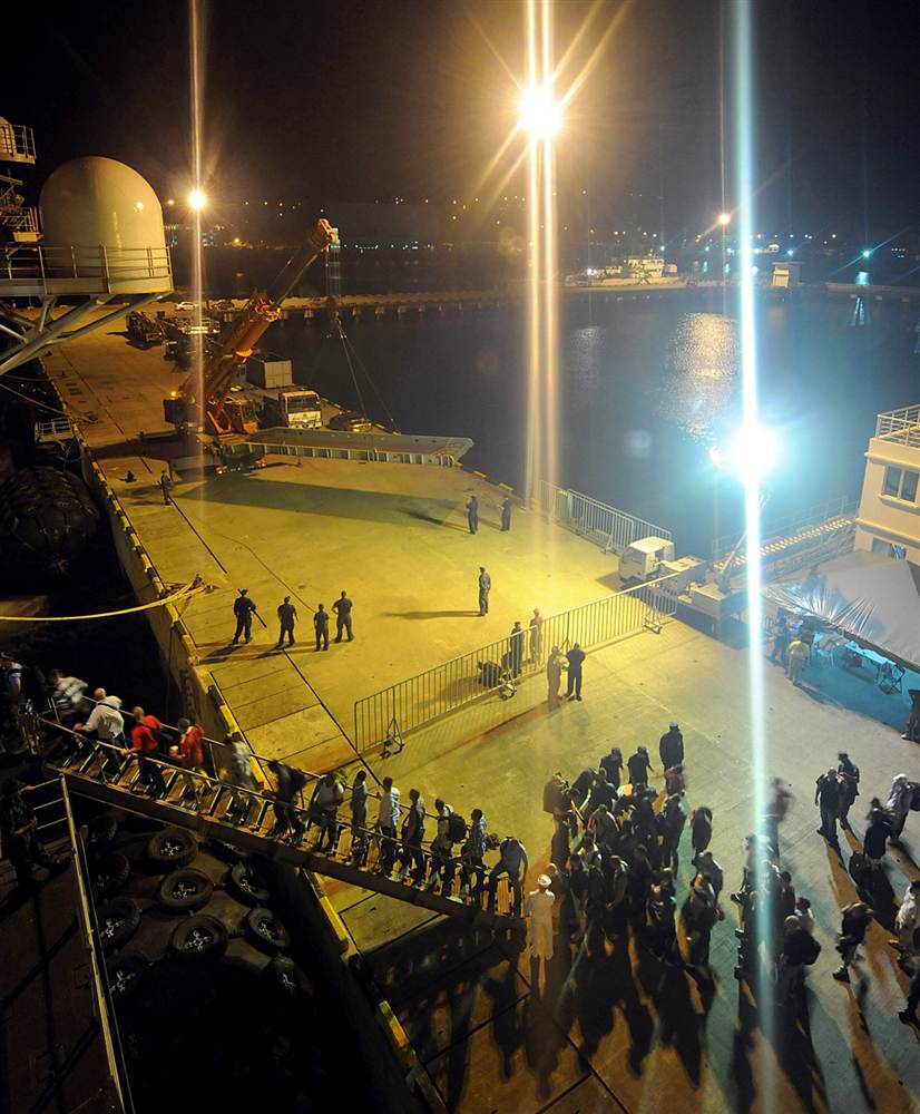 Marineros estadounidenses asignados en el buque de desembarco anfibio USS Essex y marines estadounidenses de la Unidad de Expedición 31 vuelven al barco el 11 de marzo en Sepanggar, en la base naval de Malasia. El Essex partió hacia Japón para ayudar en la catástrofe del terremoto y el tsunami.