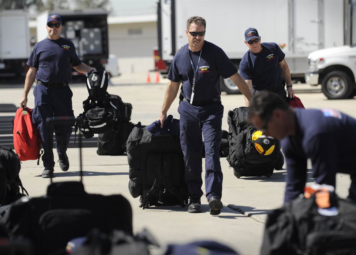 Miembros del Equipo de Rescate y Búsqueda Urbana del Condado de Los Ángeles se preparan para partir hacia Japón el viernes 11 en Los Ángeles.