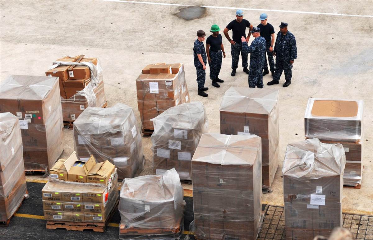 Marines cargan agua embotellada a bordo del portaaviones estadounidense Ronald Reagan cerca de las costas japonesas, en esta fotografía de comunicado de prensa de la armada de Estados Unidos del 16 de marzo. El portaaviones provee ayuda humanitaria a Japón como apoyo a la «Operación Amigo«, a raíz del terremoto de magnitud 9.0 y el posterior tsunami.
