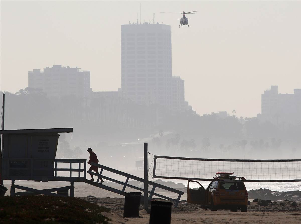 Un socorrista y un helicóptero de patrulla del Departamento de Policía de Los Ángeles rastrean la playa desierta de Will Rogers el viernes, mientras las autoridades alertan a la población para evacuar la zona ante un posible tsunami.