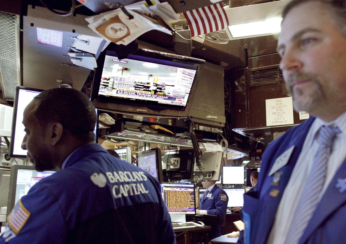 Operarios trabajando en una planta de la Bolsa de Nueva York el 11 de marzo mientras imágenes del terremoto en Japón aparecen en la televisión.