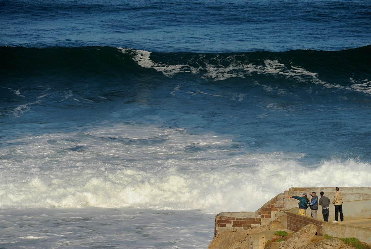 En plena alerta de tsunami el 11 de marzo para la costa californiana, varios turistas observan romper las olas en la playa Ocean Beach, San Francisco.