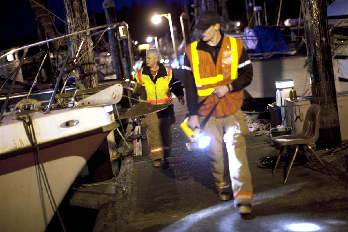 Linda Willis y Christian Nelligan del Distrito de Protección Rural de incendios de Charleston, comprueban si se encuentran personas en los muelles y en los barcos en Charleston, Oregón, durante la alerta de tsunami el 11 de marzo.