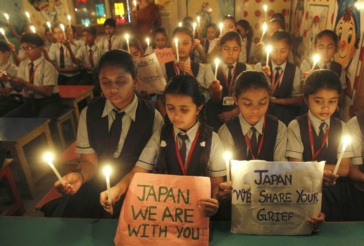 Estudiantes de la ciudad de Ahmedabad, al oeste de la India, rezan en su escuela el 11 de marzo por las víctimas del terremoto de Japón.