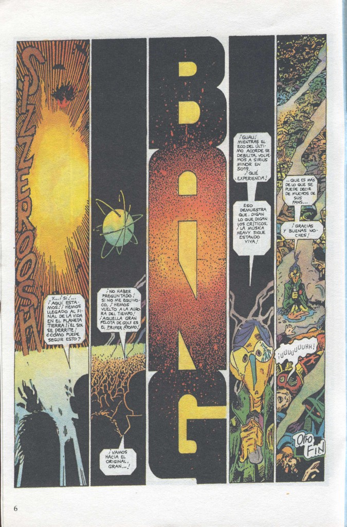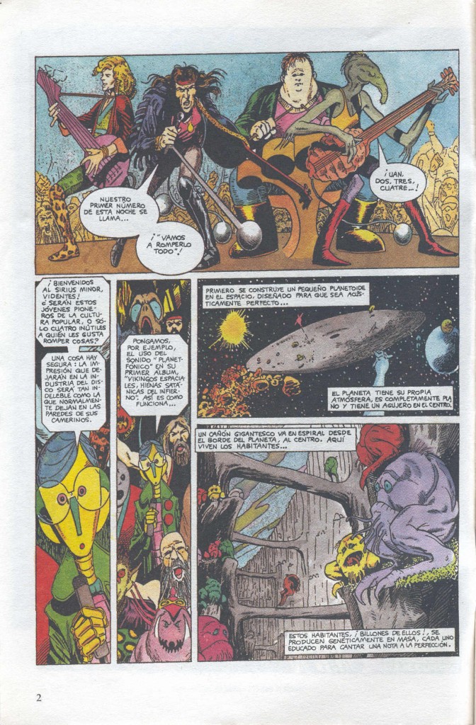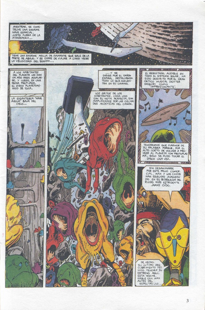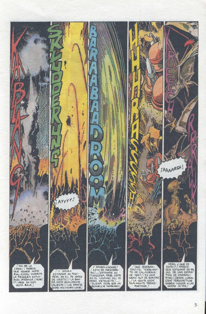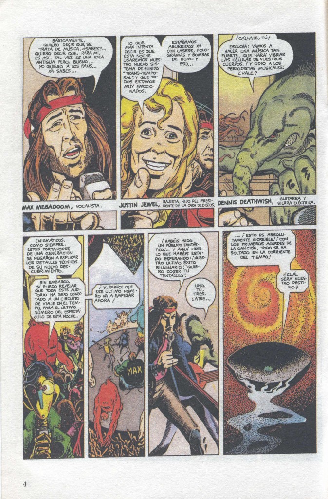 En concreto, el grupo “Max Megadoom y las Bombas de Relojería” inventa el sonido platafónico, que ya había utilizado en su disco “Vikingos espaciales, hienas satánicas del infierno”. Aunque para esta historia, planean probar su nuevo sonido “Trans-temporal” con el tema “Quiero coger tus tentáculos”. Muy bueno ese guiño irónico al otorgarle al músico Dennis Deathwish los instrumentos guitarra y sierra eléctrica o la forma que tiene de hacer la cuenta atrás (“Uan, dos, tres, cuatre” o “Uno, tu, tres,catre”).