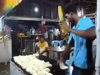 Este trabajador indio prepara parathas (pan plano típico indio) a la velocidad del rayo, y encima se permite el lujo de lanzarlos a distancia para que sean cocidos. Todo ello sin mirar y encima la masa cruza por encima de una zona de paso de gente.