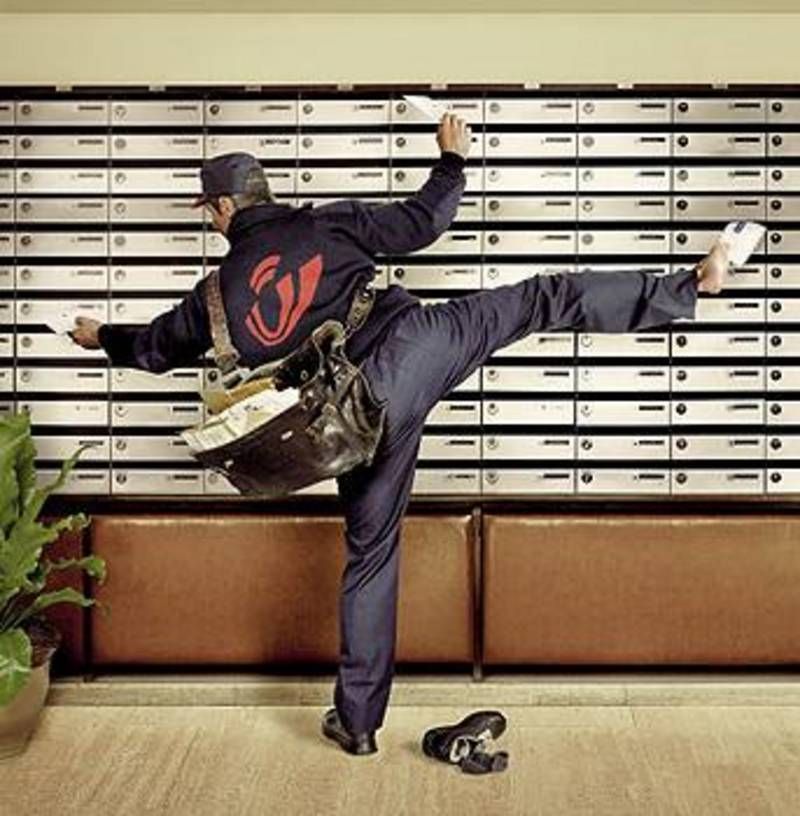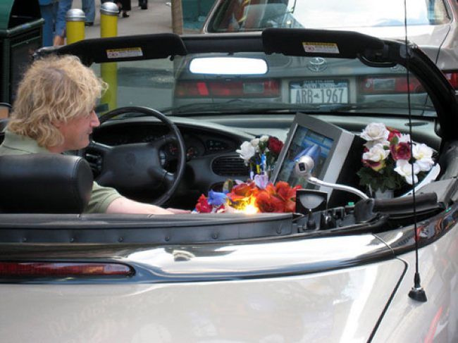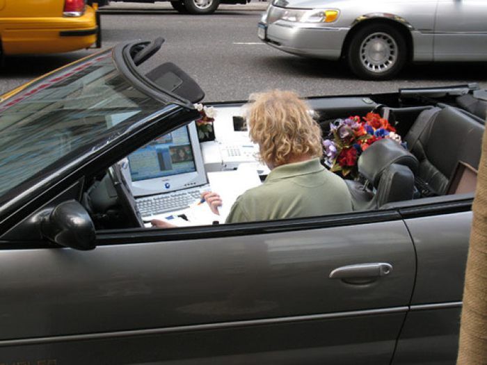 Mira que bien se ha montado la oficina en el coche. Pobre cartero el ritmo que lleva.