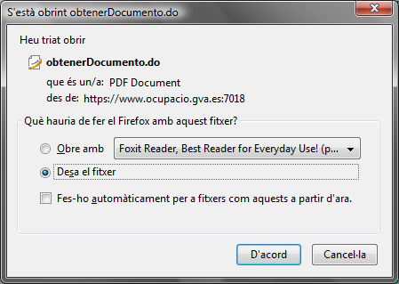 Esto se debe a que el fichero se envía al navegador con el nombre del script que lo genera (el ya mencionado obtenerDocumento.do) y no con, por ejemplo, [secuencia de números aleatorios].pdf, lo cual evitaría al usuario poco avezado tener que buscarse las castañas para saber cómo demonios abrir “ese archivo de extensión rara que se ha bajado de la web de la Generalitat” y que en verdad no es más que un fichero PDF con extensión incorrecta.