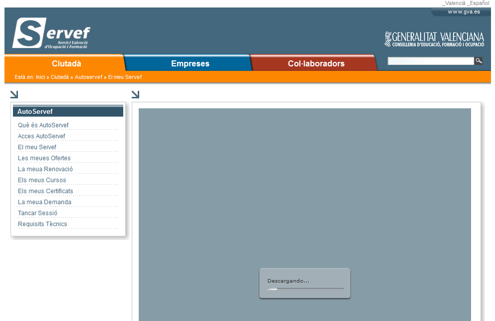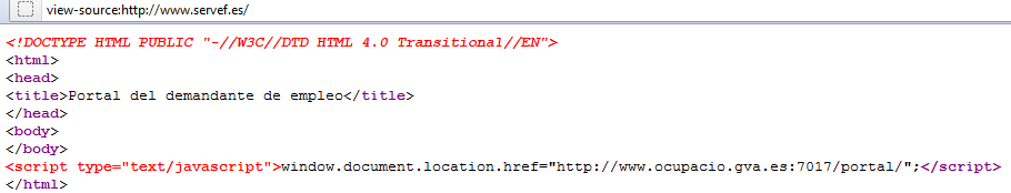 Si accedemos a la dirección www.servef.es (actualmente www.labora.gva.es/es/ciutadania), seremos redireccionados (mediante Javascript insertado de forma incorrecta en el HTML, lo cual tiene ya su miga…) a la siguiente URL: