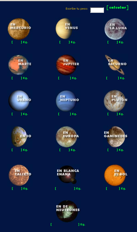 1. Alá! Qué pagina más chula! :) Mola saber cual es tu peso en otros planetas. Jajajajaja, pero en algunos peso 13 kilos :S Que poco!