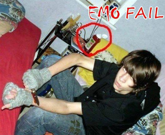 Este emo quería emular el espíritu emo haciendo apología del suicidio y al muy inútil se le olvidó esconder el ketchup que había empleado para simular estar cortándose las venas. Si es que, de donde no hay, no se puede sacar.