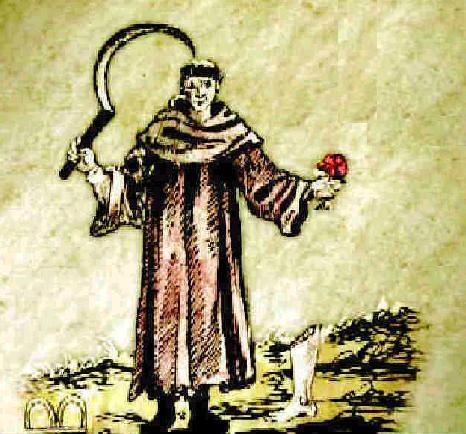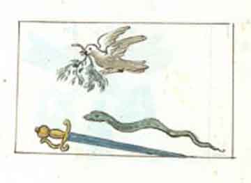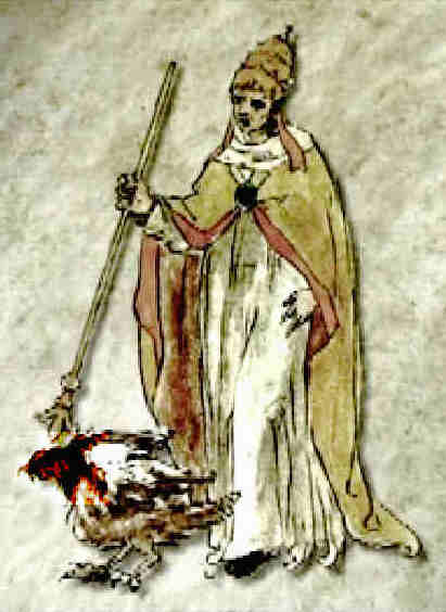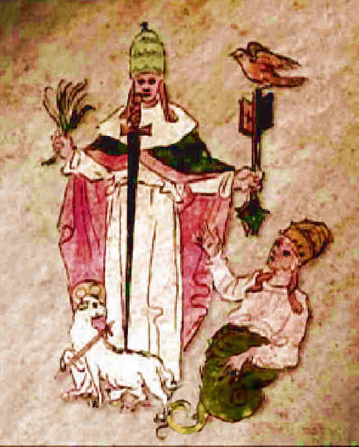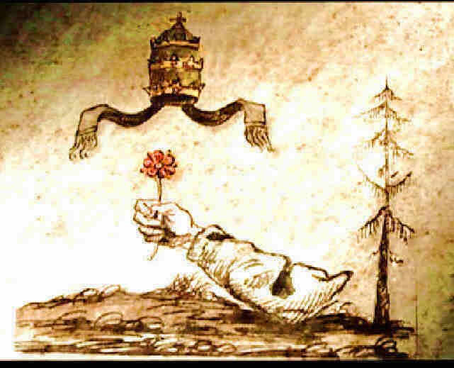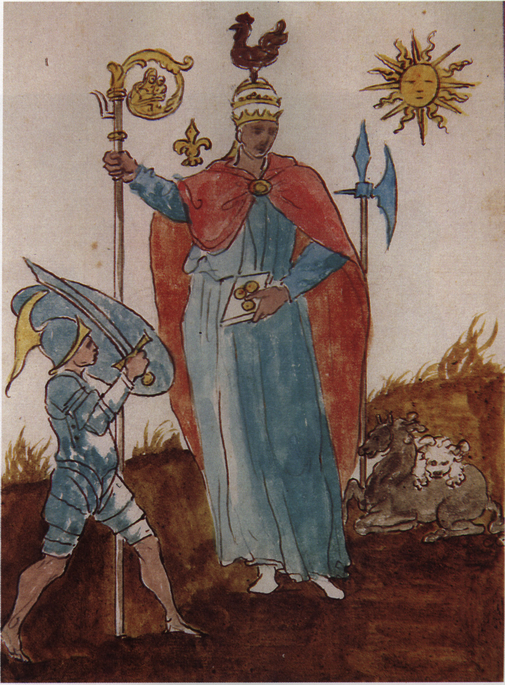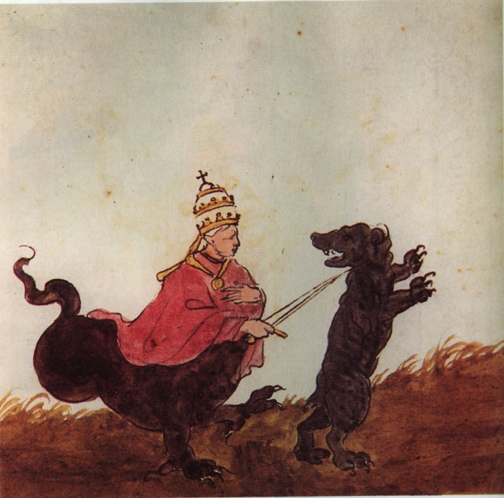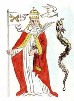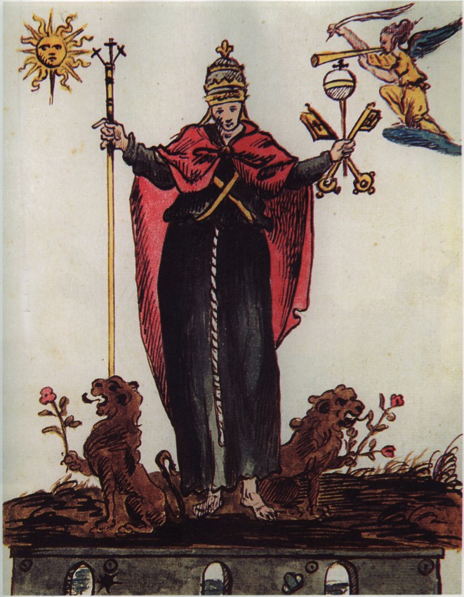 El papa Pío VII (nacido Barnaba Chiaramonti), que fue apresado en Francia por Napoleón y sus revolucionarios, está representado en la imagen de abajo vestido de monje, con una rosa en una mano y una hoz en la otra. Una letra B está dibujada en el suelo y se pueden divisar unas montañas en el fondo (chiarimonti significa «montañas claras»).