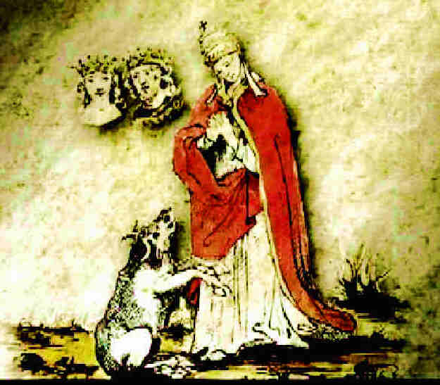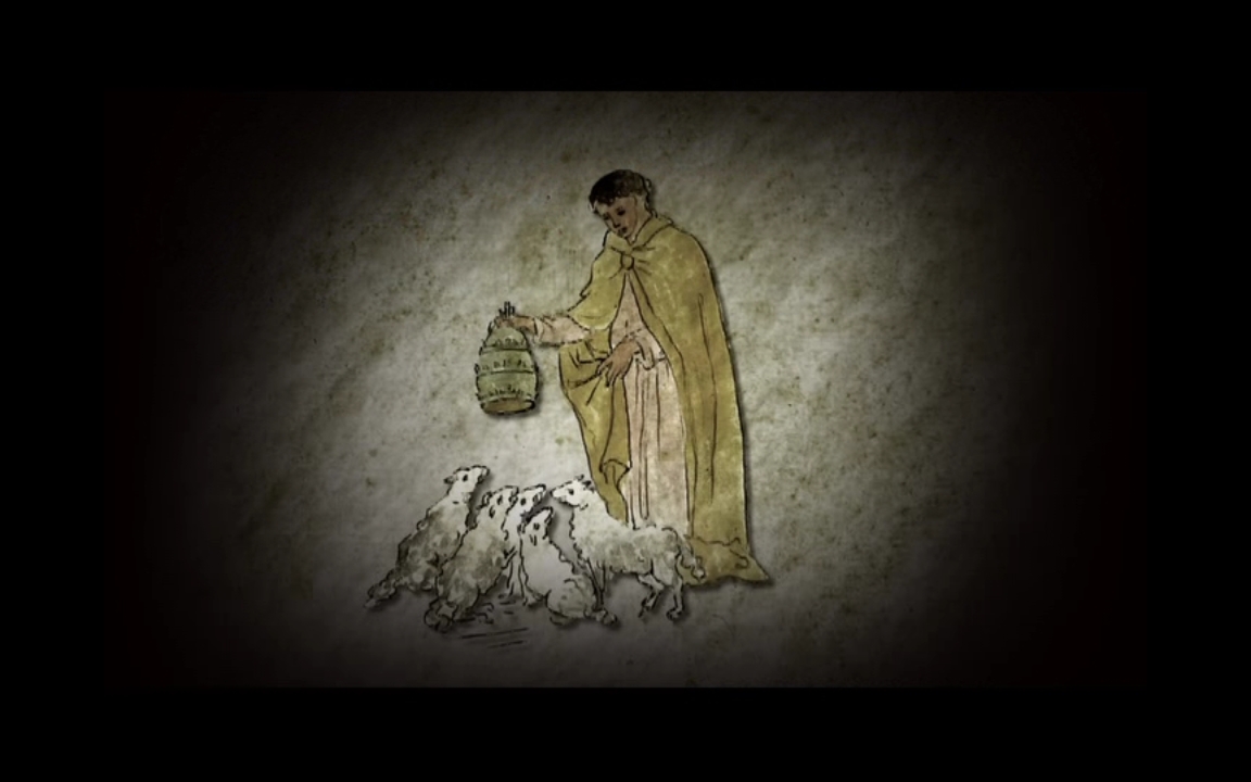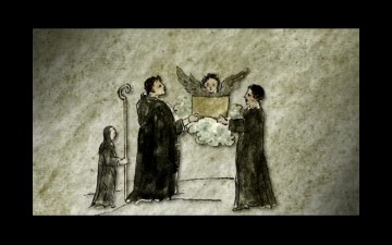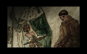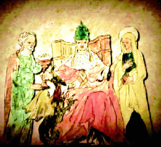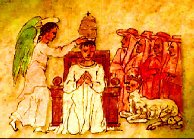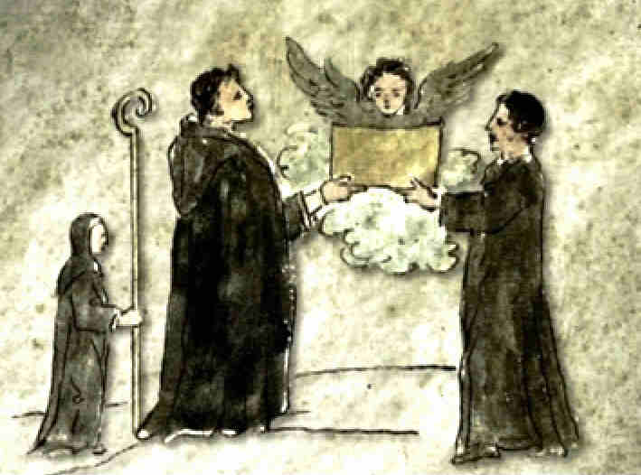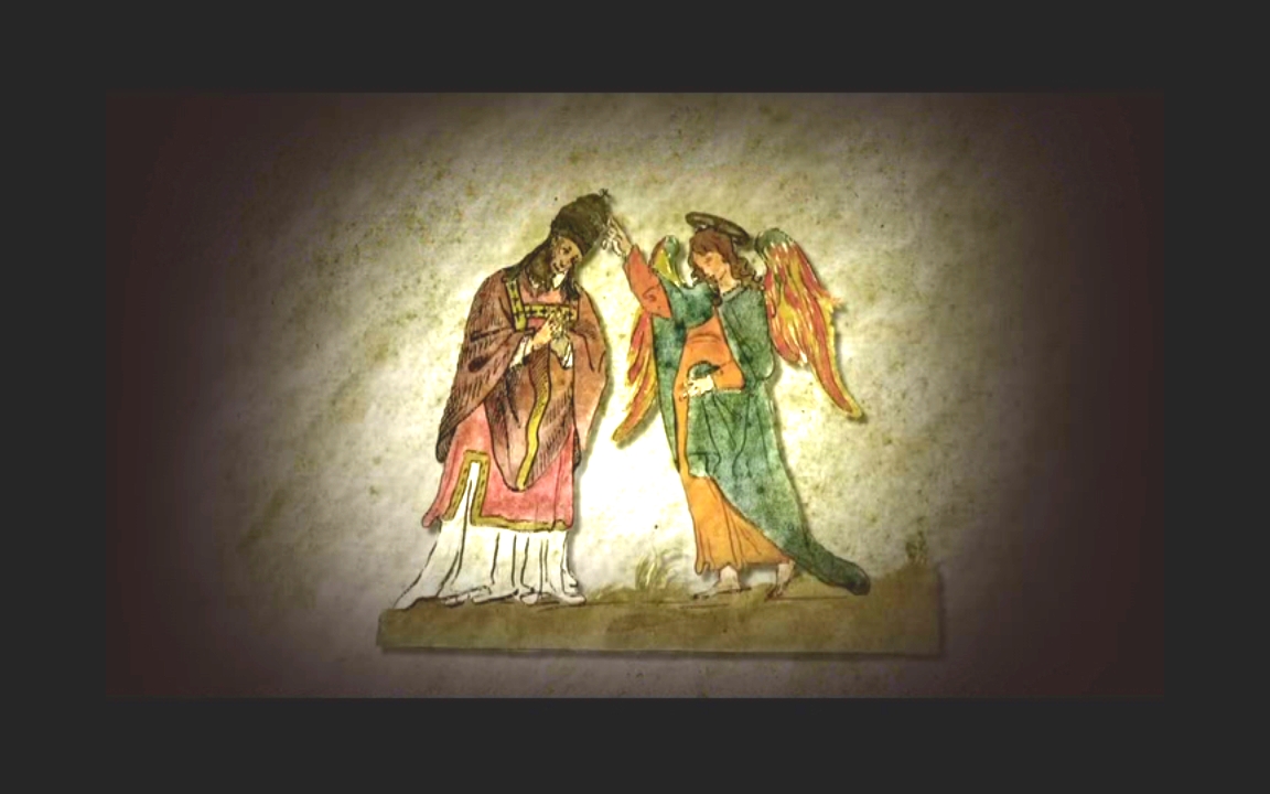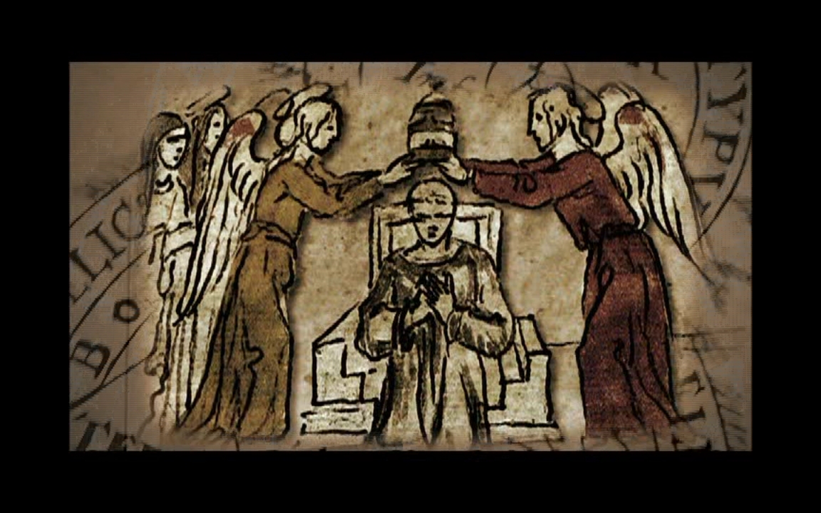 En la imagen de la izquierda vemos al papa y Luisa Piccarreta sosteniendo el «Libro del cielo» con una pequeña monja (Madre Teresa de Calcuta) que sostiene el báculo del papa.