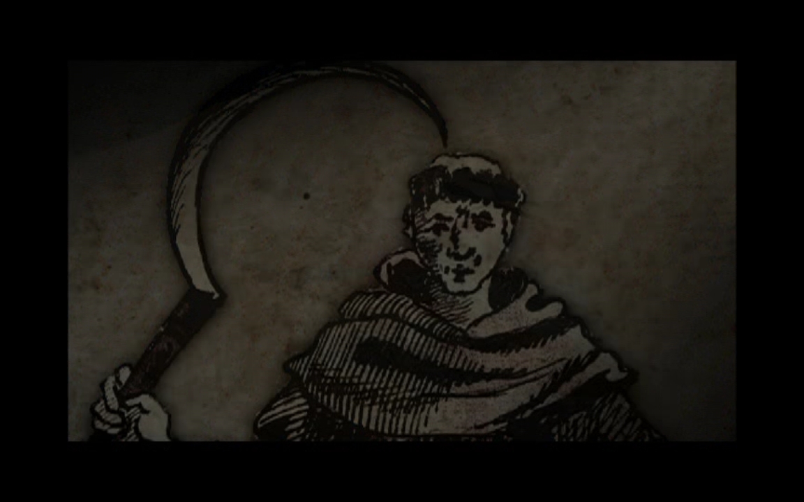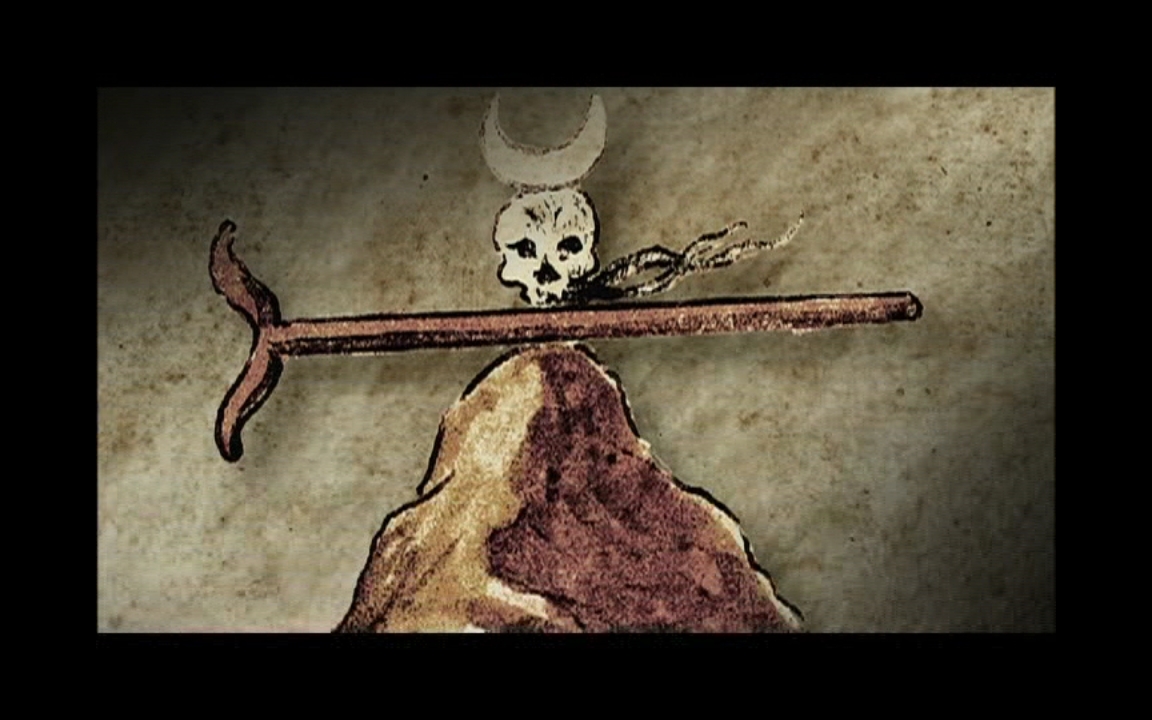 La imagen de abajo representa el año 2012, según predicciones calculadas. La página en blanco indica que ninguna persona quedará viva para poder escribir la historia. La rueda de la vida aparece ahora sin puntas.