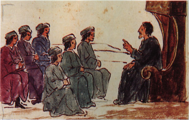 Esta imagen de abajo parece representar un procedimiento cabalístico: un hombre de larga barba emplea una hoja con espacios para leer el libro que sostiene, y de esa forma extrae un mensaje empleando un sistema cabalístico de salto de letras. Según Cesare Ramotti, el cábala de Nostradamus corresponde a la secuencia de extracción 1-5-5-5, un código similar al empleado por escolares judíos para extraer «mensajes ocultos» del Tora.