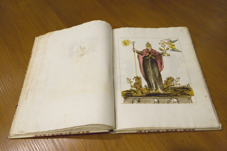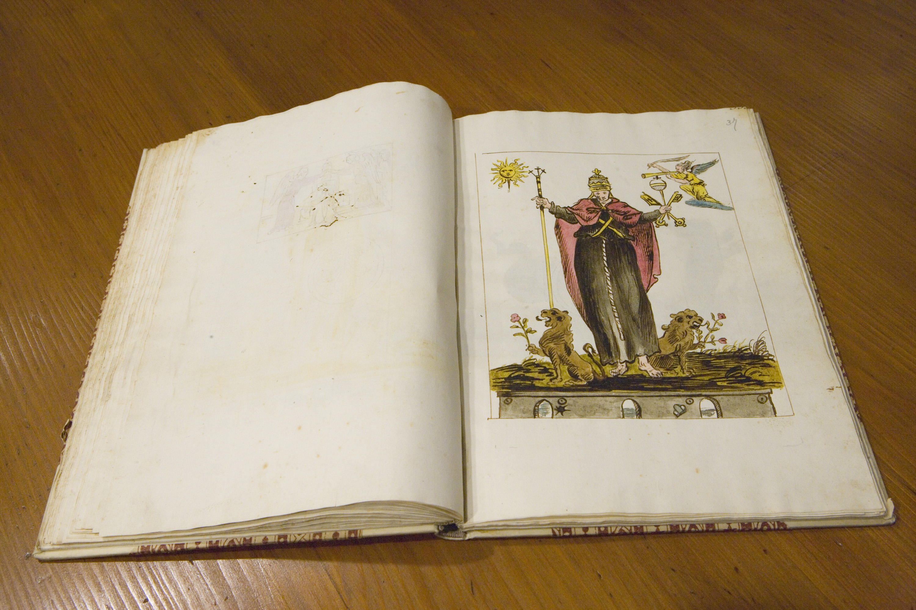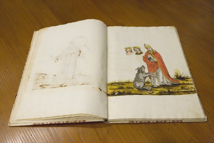 Las crípticas ilustraciones que aparecen en él varían de lo extraño a lo bizarro, con imágenes de papas, decapitaciones, extrañas criaturas, objetos simbólicos, cartas, estandartes cruzados, cornetas, velas o incluso tres estilos de escritura. Algunas de estas escrituras parecen formar figuras similares a números romanos o referencias ocultas a nombres personales.