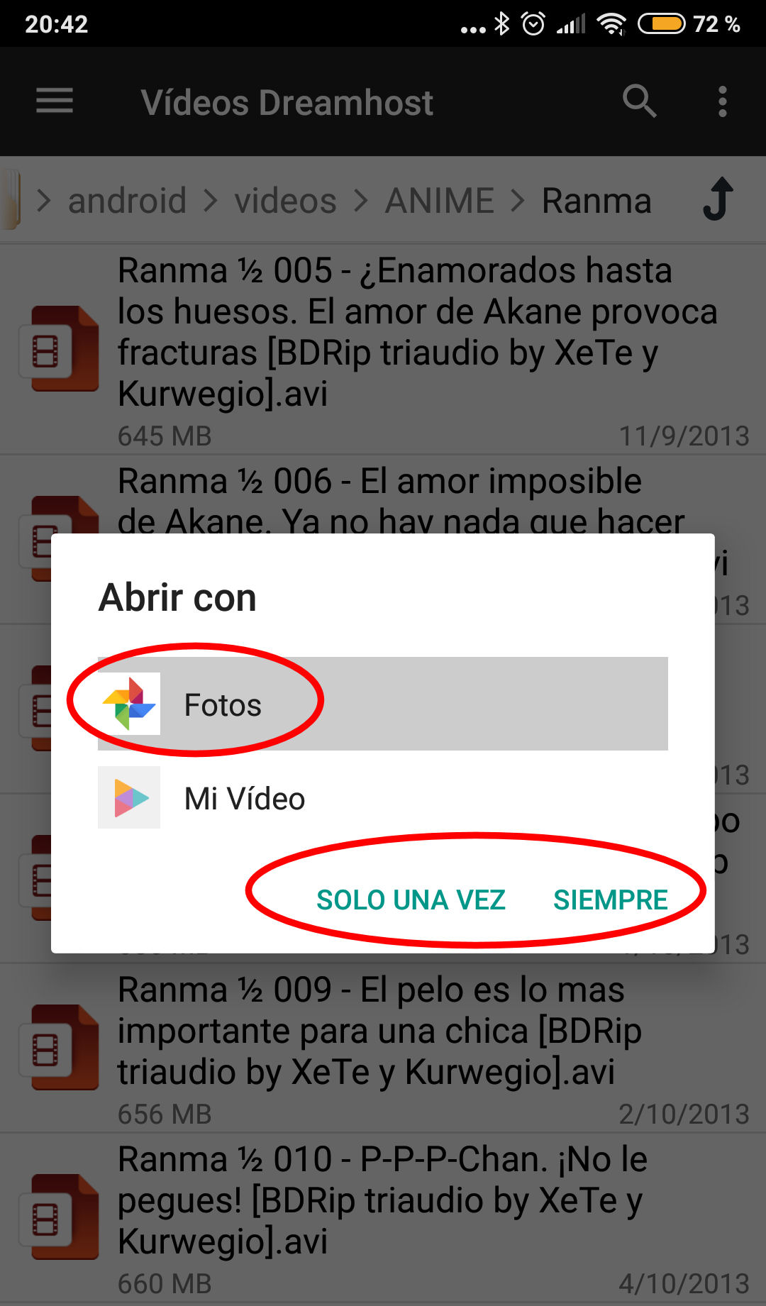 Si queremos abrir un fichero, simplemente pulsamos, y el entorno android nos preguntará cómo queremos abrir el archivo. En este caso como es un vídeo, android nos pregunta para verlo con la aplicación de Fotos o la de Mi Video. Luego podemos decirle SOLO UNA VEZ o SIEMPRE si queremos que no nos pregunte cada vez que vamos a abrir un vídeo. Las primeras veces mejor decirle que solo una vez, y cuando estemos seguros de que cierta aplicación es la más adecuada para abrir vídeos, por ejemplo, ya le podemos decir siempre.