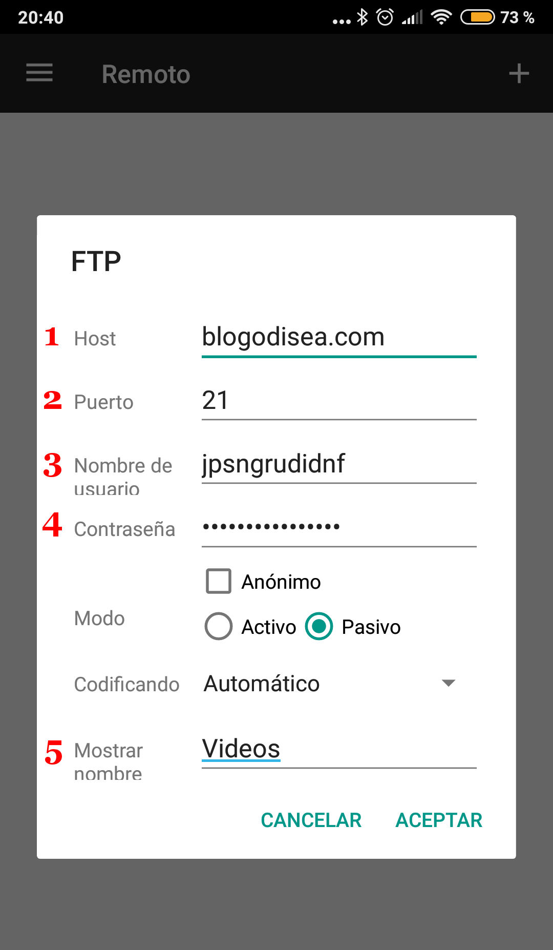 En el punto 4 o CONTRASEÑA debemos introducir la contraseña para acceder al FTP, esta información varía según el caso también como ocurre con el nombre de usuario. Ojo, que las mayúsculas y minúsculas suponen una diferencia, así que hay que respetarlas.