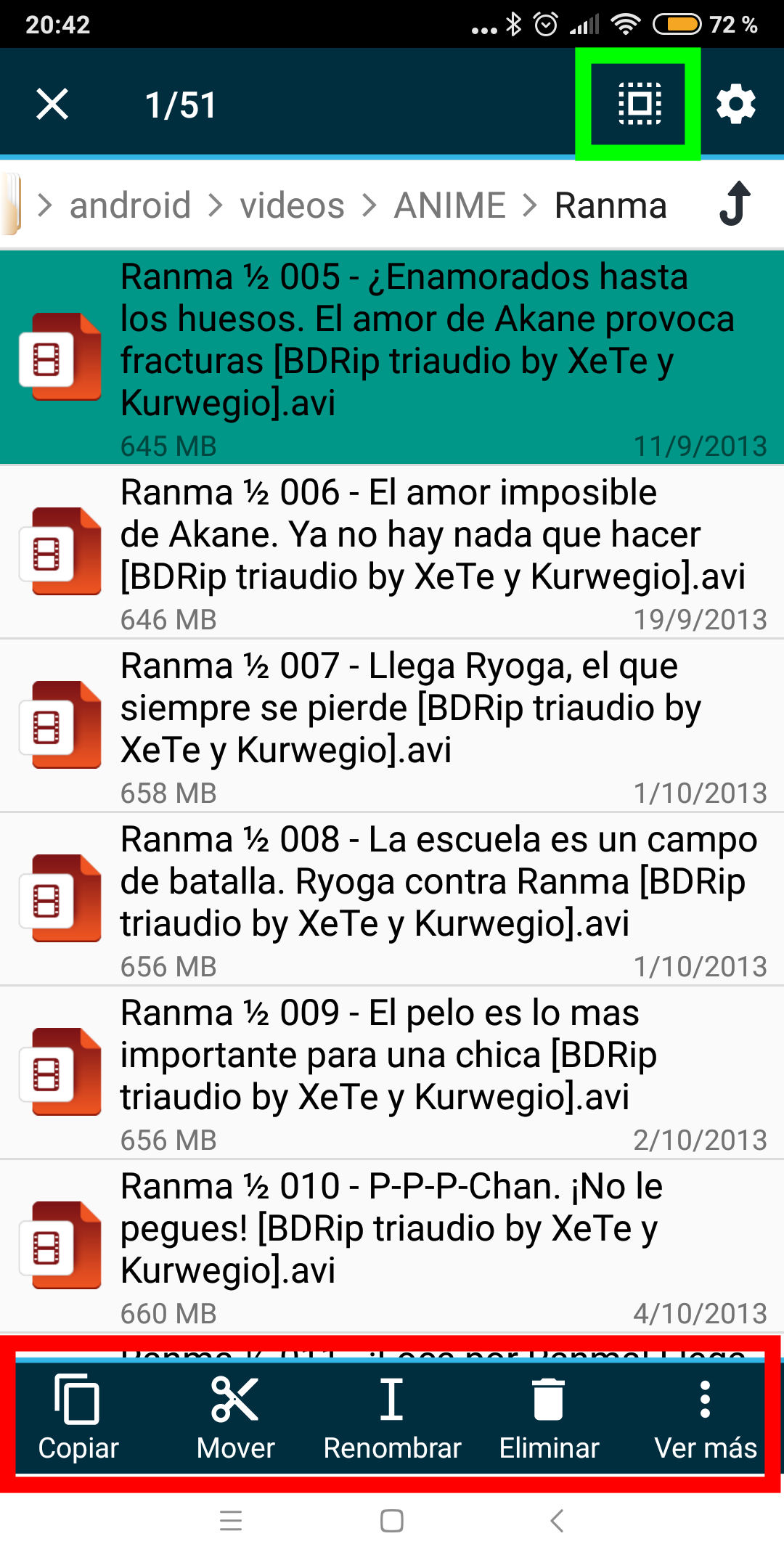 Y como FTP significa Protocolo de Transferencia de Ficheros, vamos a hacer uso de esta posibilidad, aunque os recuerdo que podemos disfrutar sin problema de esos ficheros de manera remota, sin tener que descargarlos. Por ejemplo, si queremos copiar un archivo remoto a nuestro dispositivo móvil, simplemente vamos a pulsar ese archivo un segundo sin soltar el dedo. El archivo, en vez de abrirse, se quedará marcado en negrita. Es entonces cuando podemos realizar varias opciones con él como vemos en la franja de abajo, ya sea COPIAR, MOVER, RENOMBRAR, ELIMINAR y en VER MÁS tenemos COMPARTIR, AÑADIR MARCADOR, ABRIR CON y PROPIEDADES. Si pulsamos el cuadrado ese que os he marcado en verde, seleccionaremos todos los ficheros a la vez. Podemos ir añadiendo más ficheros a la selección si los vamos pulsando uno a uno, y se quedarán marcados en negrita.