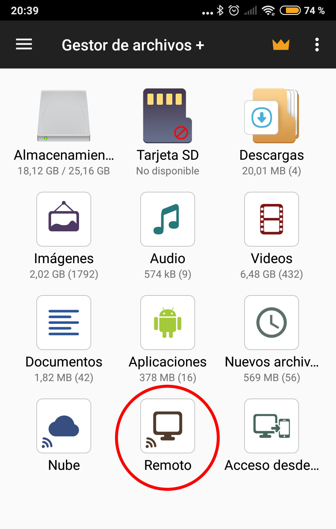 En ese menú principal tenemos la papelera de reciclaje, el inicio de todos los menús, el almacenamiento principal, la tarjeta SD en caso de tenerla, etc… Como queremos copiar ese archivo a nuestro móvil, por ejemplo, elegimos ALMACENAMIENTO PRINCIPAL.