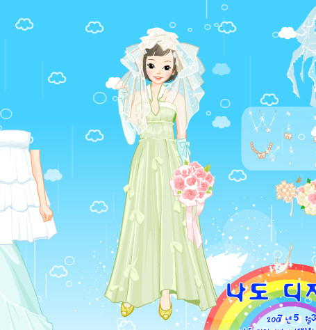 Juego para vestir a esta chica con trajes y vestidos de novia para una boda primaveral. Dispones vestidos de novia de palabra de honor, vestidos cortos, largos, velos, gasas, centros florales, guantes, zapatos, pendientes, collares y broches como joyas…