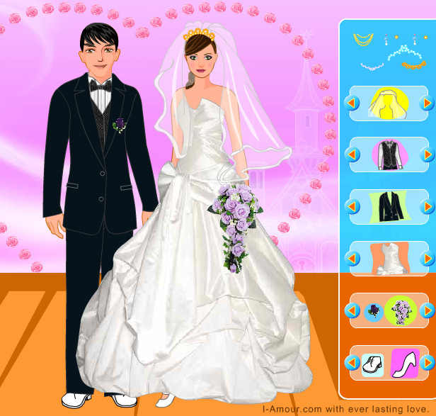 En este juego podrás vestir a los novios con diversos estilo de ropa. Podrás vestir a la novia y al novio por separado, empezando por el velo, gasa o tul de la novia, y luego escogiendo el estilo de ropa para el novio. Tienes mucho fracs, chalecos, trajes elegantes y de boda, camisas y pantalones. Siguiendo con la novia, puedes escoger un traje de novia largo y bonito, el adorno de flores para la novia y un adorno para el novio en forma de flor.