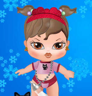 Juego para vestir a la bebé Bratz con ropa y complementos. Podrás arreglar al bebé con diademas para el pelo y peinar su pelo haciendo click en él para cambiar el peinado. También podrás cambiar el color de la piel y ojos, así como maquillar los labios escogiendo un color de pintalabios y las pestañas eligiendo un rimmel. Para vestir a la bebé con ropa diferente, haz click en sus vestiditos, y termina el estilismo poníendole pendientes, bolsos o mascotas.