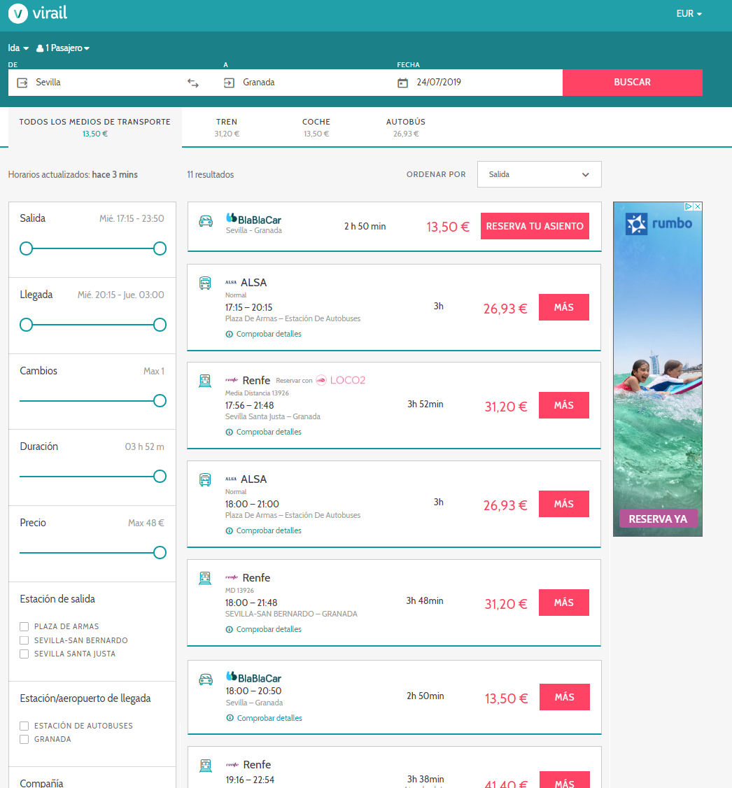 Encontrar el viaje recomendable en este portal es muy sencillo. Para ello vamos a realizar una simulación buscando el viaje desde Sevilla a Granada como ejemplo. Simplemente introducimos en el buscador el punto de salida (en este caso Sevilla), el de destino (Granada) y la fecha en que nos desplazaremos. También podemos buscar un viaje de ida y vuelta o seleccionar la cantidad de pasajeros que seamos, en caso de viajar acompañados.