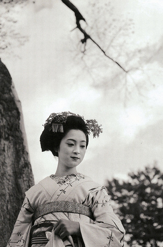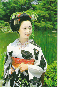 Mineko Iwasaki durante su segundo o tercer año como Maiko. El ornamento que porta en su parte derecha, es el símbolo de las geishas del distrito de Gion Kobu. Cada distrito está representado por una joya de jade que se incrusta en un círculo, simbolizando la unidad. Esta horquilla sólo la portan las Maiko de Gion Kobu hasta que llegan a los 18 años.