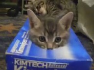 Con este me parto. Primero acosan a un gatito que está en una caja como de pañuelos, pero luego uno de esos gatos intenta entrar en la caja como puede mientras el otro se niega a ceder su puesto.