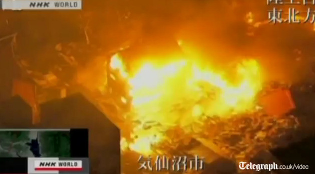 El puerto de Sendai en llamas mientras bomberos atajan los numerosos fuegos y equipos de salvamento buscan entre los escombros. Me pregunto qué hace el gato que aparece en el vídeo tan quieto, pobrecico.