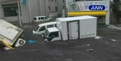 El tsunami entra en la ciudad de Kesennuma y no perdona el mobiliario urbano, absolutamente todo es arrastrado por el agua.
