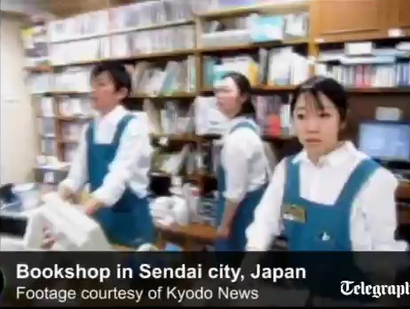 Una librería de Sendai sufre los embistes del terremoto.