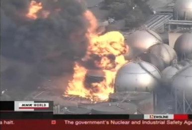 Ciudad de la prefectura de Miyagi anegada totalmente por el agua, aparte de la explosión de la refinería de petroleo de Chiba.