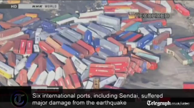 Puerto de Sendai devastado, increíble ver los contenedores tirados por el suelo. Seis puertos japoneses sufrieron daños graves, en el caso del de Sendai, quedará inoperativo durante meses, afectando a su comercio internacional.