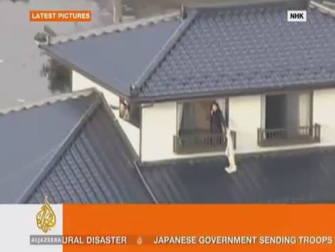 Secuencias del aeropuerto de Sendai y la gente en la azotea, aparte de un refrito de imágenes que se ha visto en todos los noticieros varias veces, como el de la mujer que ondea una tela desde la planta alta de su casa que está rodeada de agua. Incendios de la refinería de petroleo, el tsunami, oficinas, el primer ministro en un comunicado, etc…