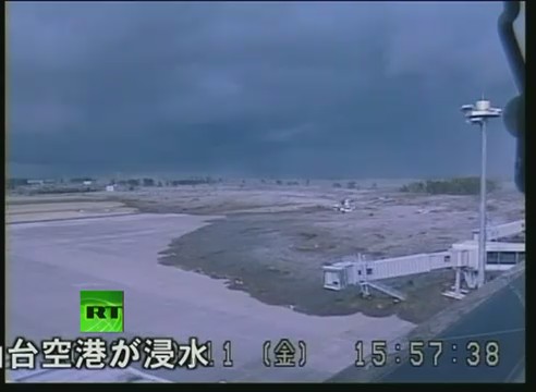 La ola del tsunami en el momento que va entrando en el aeropuerto de Sendai.