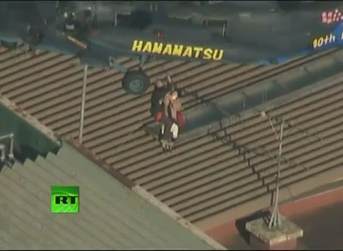 Rescate con helicóptero de personas que se encuentran en la azotea de un edificio de la ciudad de Kesennuma, y la posterior invasión del agua a las calles de esa localidad, que es impresionante.