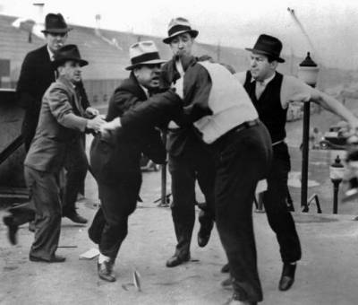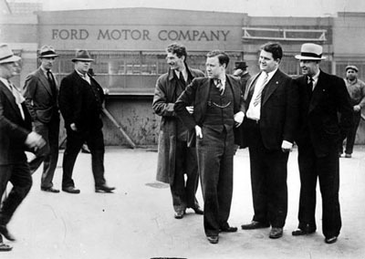 Richard T. Frankensteen, el director organizador de la U.A.W., con el abrigo cogido por su cabeza, fue brutalmente golpeado en la puerta de la planta Ford River Rouge de Dearborn, Michigan. El conflicto ocurrió tres meses después de que la U.A.W. consiguiese su primera victoria en la Ford, al forzar a la compañía a negociar una póliza sobre el trabajo organizado, tras una larga sentada huelguista en el complejo Rouge.