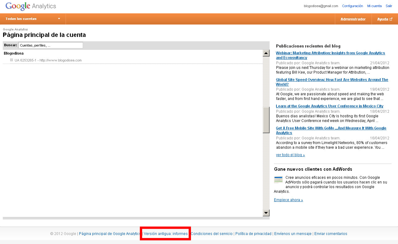 Ahora que Google Analytics ha eliminado lo de «Volver a la versión anterior», que estaba en la parte superior del servicio, he descubierto que sigue estando abajo, algo más escondido, en el enlace «Versión antigua: informes». No sé cuánto tiempo más estará ahí, pero espero que sea para siempre, porque es un engorro hacer consultas rápidas entre varios sitios web en la nueva versión.